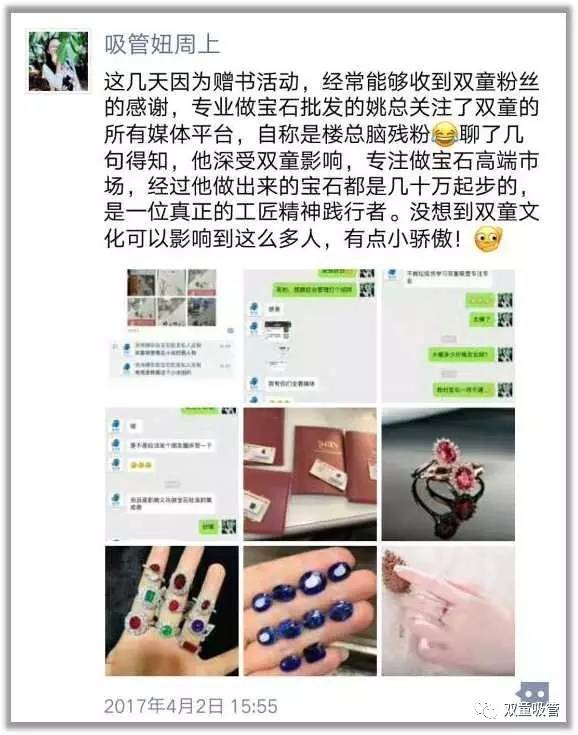 比如說,有一位做寶石批發(fā)的粉絲,不僅關(guān)注了“雙童”的所有媒體平臺(tái),自詡是當(dāng)家人樓總的腦殘粉,而且真真實(shí)實(shí)地將“雙童”文化融合入自己的創(chuàng)業(yè)經(jīng)營(yíng)中。他說,自己深受“雙童”文化影響,拒絕劣質(zhì)低價(jià),專注做高端寶石,從他的雙手中做出的寶石都是幾十萬起步,真是身體力行地在實(shí)踐工匠精神吶!(妞內(nèi)心os:我們的粉絲怎么這么壕?。?/span>