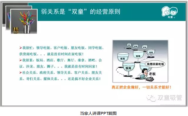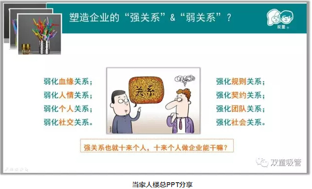 當家人樓總十分注重關系哲學,畢竟一個人的能力是有限的,他能發(fā)展的強關系范圍也就只有十來個人,在企業(yè)經(jīng)營中,十多個人的作用并不大!在企業(yè)內(nèi)部要弱化血緣關系,強化規(guī)則關系;弱化人情關系,強化契約關系;弱化個人關系,強化團隊關系;弱化社交關系,強化社會關系。