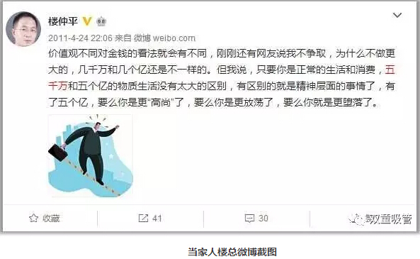 沒錢談不上自由,但有錢也未必自由。原始積累很重要!當家人樓總幾年前發(fā)的一條微博道出了他的看法:價值觀不同對金錢的看法就會有不同,其實只要你是正常的生活和消費,50000000和5個億的物質(zhì)生活不會有太大的區(qū)別,有區(qū)別就是精神層面的事情了,有了5個億,要么你就更“高尚”了,要么你是更放蕩了,要么你就是更墮落了。