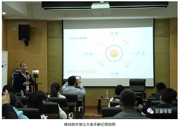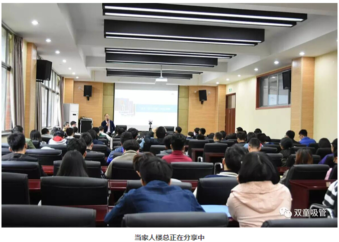 課程開始后,當(dāng)家人樓總介紹了自身的創(chuàng)業(yè)經(jīng)歷,在不斷失敗的教訓(xùn)中,他選擇沉下心來專注做好一根吸管!樓總也通過自身的經(jīng)歷告訴學(xué)生們不要一直想著失敗是成功之母,要想著如何成功,好好認(rèn)知為什么成功,不斷地總結(jié)、探索、認(rèn)知,這是創(chuàng)業(yè)者創(chuàng)業(yè)很重要的一點!