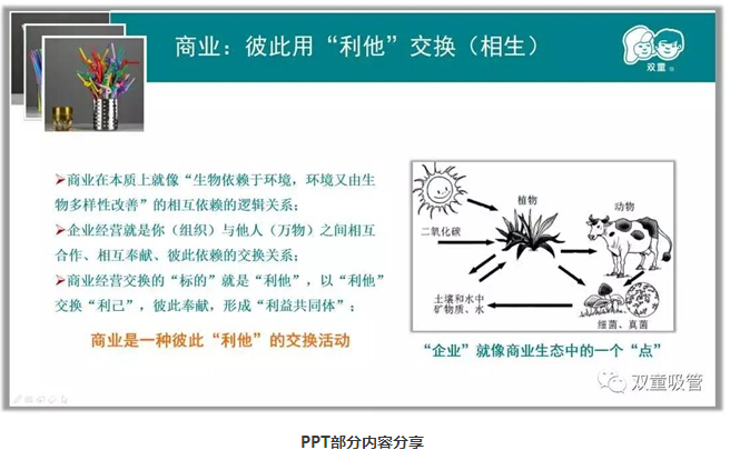 商業(yè)是一種彼此“利他”的交換活動(dòng),當(dāng)家人樓總以生物鏈中的生物為例,用“相生”、“相克”來引導(dǎo)大家理解商業(yè)的本質(zhì)。生態(tài)鏈中某一個(gè)點(diǎn)是無法獨(dú)立生存的,商業(yè)在本質(zhì)上就像“生物依賴于環(huán)境”,環(huán)境又由生物多樣性改善”的相互依賴的邏輯關(guān)系。