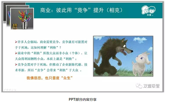 商業(yè)除了“利他”之外,還要通過競爭彼此提升。商業(yè)中的“利他”所指大眾而非小眾,讓大眾得利而犧牲小眾,本質(zhì)上就是“利他”;競爭會置對手于死地,但推動(dòng)了企業(yè)新陳代謝、技術(shù)革新,所以“競爭”會帶來“利他”于大眾 ,最終達(dá)到“無我”而“有我”,放下“自我”而成全“自我”!