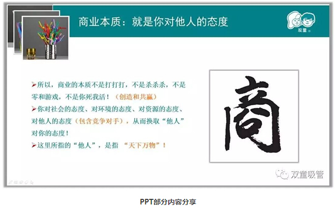 商業(yè)本質(zhì)上就是你對他人的態(tài)度,所以,商業(yè)的本質(zhì)不是打打打,不是殺殺殺,不是零和游戲,不是你死我活!“雙童”的節(jié)能降耗措施、零排放、無污染,對員工的態(tài)度本質(zhì)上就是我們對他人的態(tài)度,所以“利他”其實(shí)是利于天下萬物,商業(yè)是創(chuàng)造與共贏,你對社會的態(tài)度、對環(huán)境的態(tài)度、對資源的態(tài)度、對他人的態(tài)度(包含競爭對手),從而換取“他人”對你的態(tài)度,這也是利他的背后一定是利已的商業(yè)本質(zhì)!
