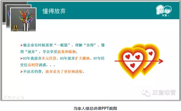 在全球經(jīng)濟(jì)形勢(shì)并不樂觀的大背景下 ,不少企業(yè)遭遇著生存困境,有的甚至面臨倒閉。吸管妞研究后發(fā)現(xiàn),大部分陷入困境的企業(yè)都有一個(gè)共同點(diǎn),就是擴(kuò)張速度過快或者過度多元化。而在“雙童”發(fā)展過程中,“雙童”樓仲平一直倡導(dǎo)做企業(yè)要“慢”,不可貪大求全,更不能為了尋求快速發(fā)展而投機(jī)取巧。樓仲平經(jīng)常說,在一定程度上其實(shí)“慢”就是“快”!今天吸管妞就和大家一起來理解這個(gè)觀點(diǎn)!