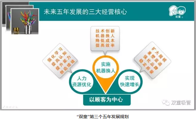 我們認(rèn)為,當(dāng)企業(yè)積累發(fā)展到一定階段時(shí),現(xiàn)有規(guī)模已經(jīng)不能滿足目前企業(yè)發(fā)展需要,可以適當(dāng)做“加法”。于是在2016年,“雙童”出臺(tái)了第三個(gè)五年發(fā)展規(guī)劃,在以顧客為中心的前提下,提出了“人力資源化”、“實(shí)施機(jī)器換人”、“實(shí)現(xiàn)快速增長”的三個(gè)關(guān)鍵詞。