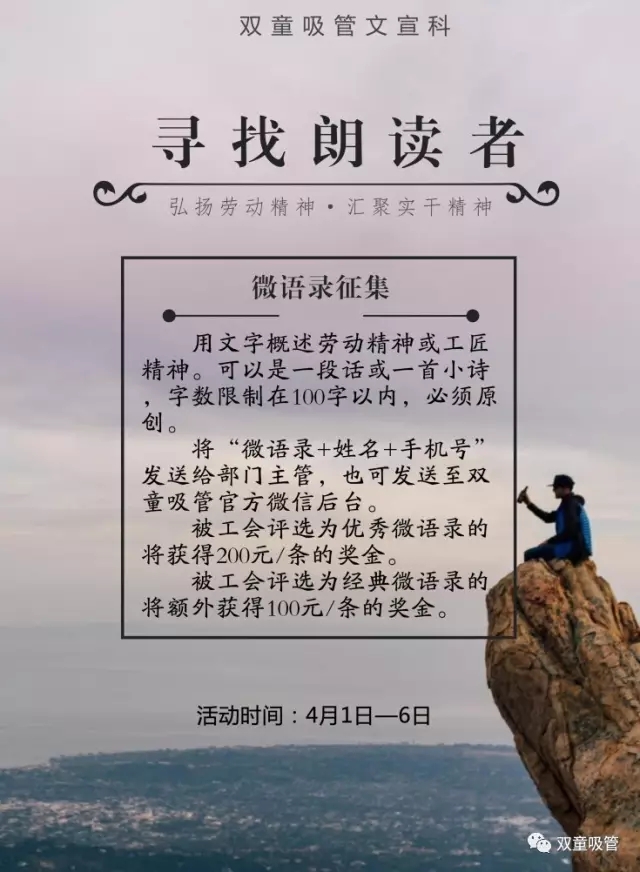 前段時(shí)間,義烏市總工會舉辦了“弘揚(yáng)勞動精神·匯聚實(shí)干力量”尋找朗讀者活動,征集以勞動精神、勞模精神或工匠精神為主題的微語錄。吸管妞一看到此次活動,就覺得這樣的活動太適合“雙童”人啦,立馬就報(bào)名啦!