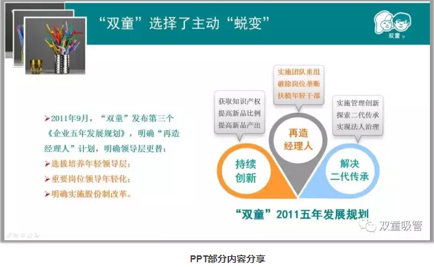 2.雙童”主動(dòng)選擇蛻變,發(fā)布了《企業(yè)五年發(fā)展規(guī)劃》,明確“再造經(jīng)理人”計(jì)劃,明確領(lǐng)導(dǎo)層更替。