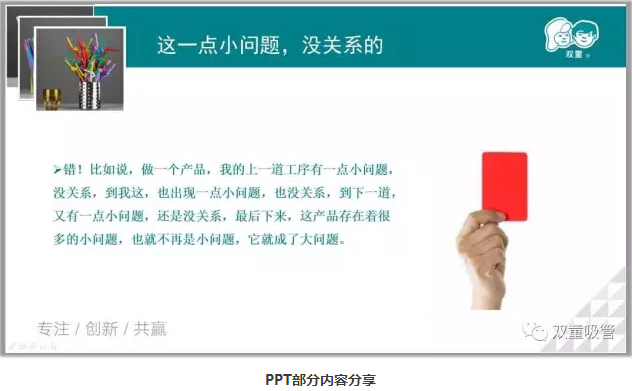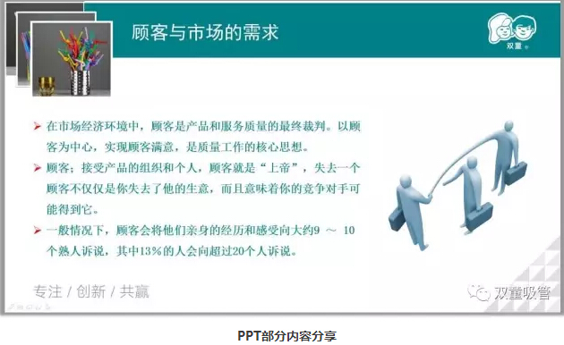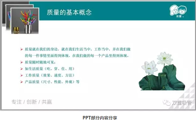 一開(kāi)場(chǎng),陳講師先介紹了質(zhì)量的定義以及質(zhì)量管理的發(fā)展史,問(wèn)及“雙童”的質(zhì)量方針時(shí),童鞋們都回答的異口同聲:“支支見(jiàn)品、杯杯見(jiàn)質(zhì);打造“雙童”品牌、提升顧客滿(mǎn)意。”