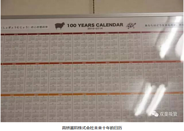 吸管妞最后還要和大家分享一個(gè)讓我們游學(xué)團(tuán)深受震撼的細(xì)節(jié)。在會(huì)議室的墻上,細(xì)心的“雙童”游學(xué)團(tuán)發(fā)現(xiàn)了一個(gè)有趣的細(xì)節(jié):墻上竟然貼著從2015年到2114年的日歷。為什么要掛一個(gè)100年的日歷在墻上呢?高橋先生笑著回答:“我們認(rèn)為人的生命短暫無常,在這100年里你無法知道自己將會(huì)在哪一天離開世界,所以每一天都需要好好珍惜,全力以赴地工作和生活,為社會(huì)帶來美好和價(jià)值!”這么棒的回答,引發(fā)了“雙童”游學(xué)團(tuán)的自發(fā)掌聲!