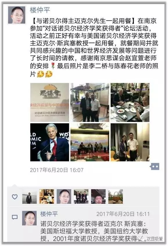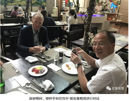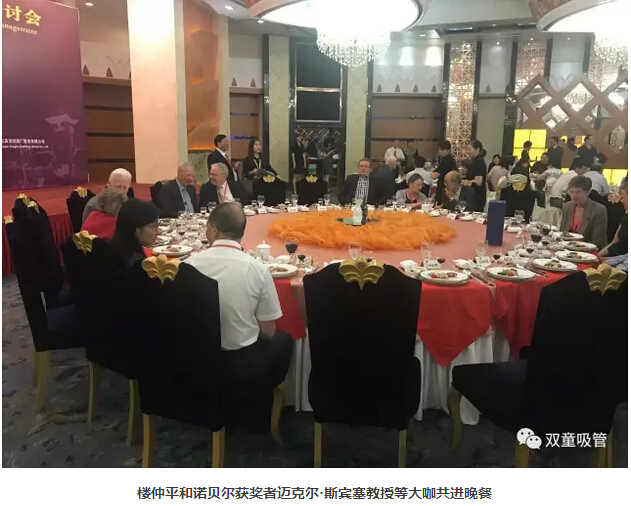 會議結(jié)束之后,樓仲平與諾貝爾獲獎?wù)哌~克爾·斯賓塞教授、北京大學(xué)國家發(fā)展研究院管理學(xué)陳春花教授等大咖一起享用晚餐。