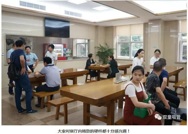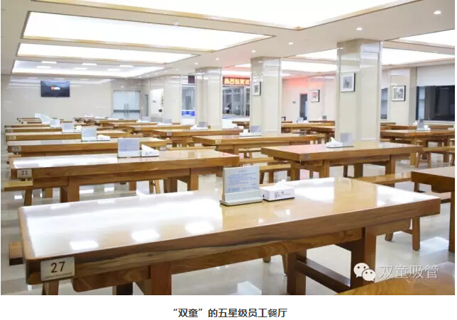來到員工餐廳時,大家都被餐廳內精致的硬件吸引,吸管妞也介紹道:“員工吃飯的地方要配備最好的硬件,餐廳內的每一張桌子都是由木中之王的柚木定制而成,每一張就要1萬多元!