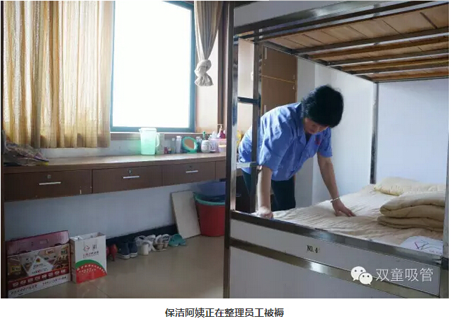 每一層我們都配有兩名打掃衛(wèi)生的阿姨,進(jìn)行衛(wèi)生間和寢室的日常打掃。保潔阿姨會(huì)將所有員工寢室的窗戶、衛(wèi)生間甚至垃圾桶等各個(gè)角落都擦拭干凈,垃圾不留過(guò)夜,就連員工的被褥每天也有阿姨進(jìn)行整理。