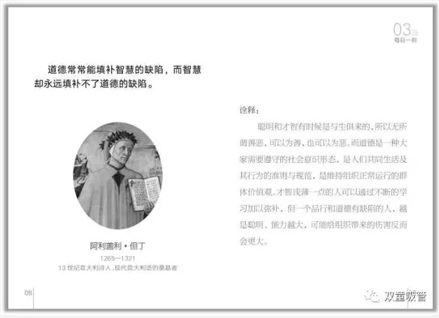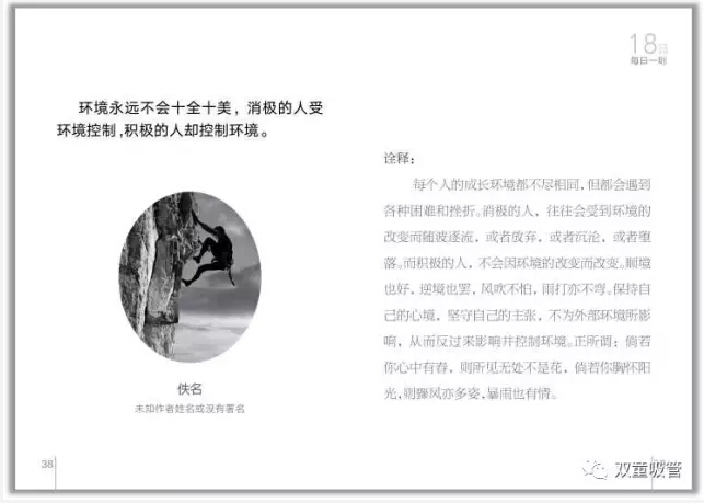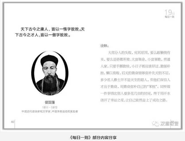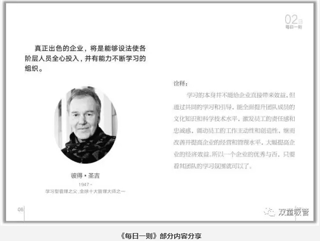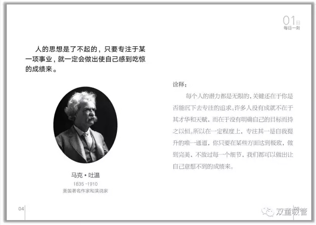 首先,就是晨讀環(huán)節(jié)。“雙童”所有員工在上班之前都會在統(tǒng)一時間誦讀“雙童”的企業(yè)文化叢書——《每日一則》。這本《每日一則》里,共收錄了31句名人經(jīng)典語錄,以月度為單位讓員工進行重復誦讀,內(nèi)容包含了專注、創(chuàng)新、共贏、正氣等主題。這可是員工們從幾千條好句里挑出來,并且自己解析的呢!