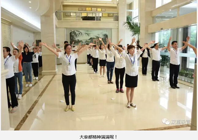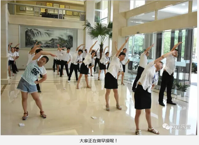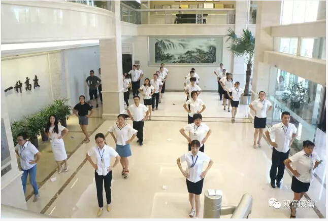 除了精神上要得到提升之外,我們的身體素質(zhì)也非常重要!每天,在晨讀環(huán)節(jié)結束之后,我們都會進行早操活動。俗話說,“一年之際在于春,一天之際在于晨”。在“雙童”行政大廳,員工們列隊整齊,精神飽滿,氣宇軒昂,伴著豪邁的音樂,用整齊劃一的動作做起早操,形成了一道靚麗的風景線。