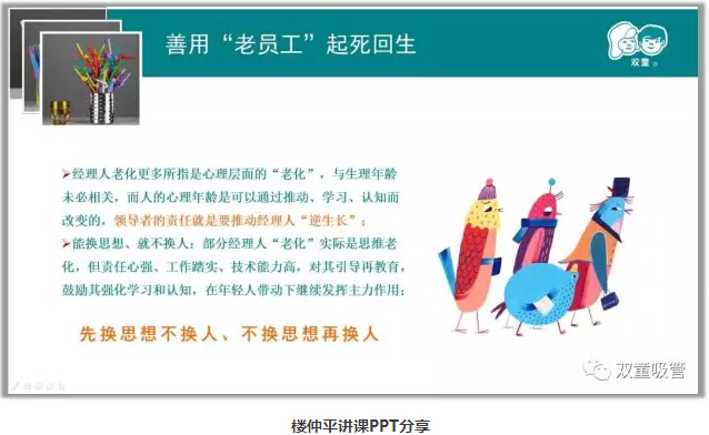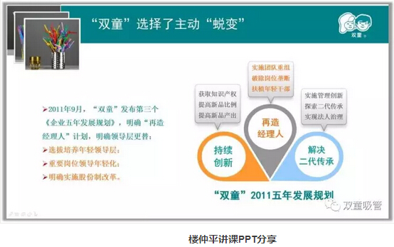 通過樓仲平個人的迭代,也促進了“雙童”團隊的蛻變,推動團隊向年輕化、知識化和信息化轉變。2011年9月,“雙童”發(fā)布了第二個《企業(yè)五年發(fā)展規(guī)劃》,明確“再造經(jīng)理人”計劃,明確領導層更替:選拔培養(yǎng)年輕領導層、重要崗位領導年輕化、明確實施股份制改革,慢慢解決管理層老化問題!重組后的“雙童”團隊平均年齡不到三十歲,大部分核心團隊的工齡在十年以上,學歷、知識層次和忠誠度大幅提高!
