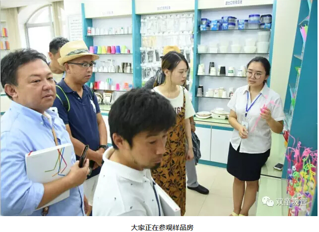 既然到“雙童”參觀,產(chǎn)品自然也是日本客人們重點關注的方面之一!當他們到樣品房看到“雙童”琳瑯滿目的創(chuàng)新吸管時,都對“雙童”的研發(fā)能力十分驚訝,甚至當即要求購買一些創(chuàng)新產(chǎn)品帶回日本作為紀念。