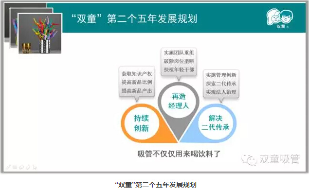 現(xiàn)在,公司有二三十個中高層,平均工齡10年以上,年齡30歲左右,都是我一個個帶出來的,“雙童”做的吸管是一個比較偏門的行業(yè),沒有行業(yè)的通用性人才,所以我們基本不用空降兵。這批人是我?guī)С鰜淼?,就深受我的影響,在乎工作、可以放下身段,整體素質(zhì)遠超第一代管理者。這批第二代管理者培養(yǎng)起來后,至少打開了“雙童”未來二十多年企業(yè)持續(xù)發(fā)展的窗口。