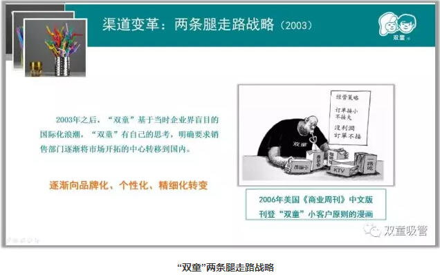 現(xiàn)在,“雙童”的小客戶達(dá)到了12000多家,這些寶貴的客戶客觀上與企業(yè)一直發(fā)生著貿(mào)易關(guān)系。正是因為訂單額不大,對產(chǎn)品有個性化要求,反而造就了很高的品牌黏性,通過訂單的積累,長期為企業(yè)創(chuàng)造著價值。通過實施“小客戶原則”和“兩條腿走路”戰(zhàn)略,“雙童”在客戶數(shù)量提高的同時風(fēng)險大大下降,從而抓住了企業(yè)的主動權(quán),帶動品牌的提升!