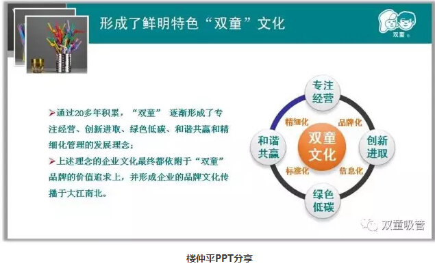 由于樓仲平在創(chuàng)立“雙童”前經(jīng)歷了20多個(gè)行當(dāng),最終選擇吸管作為自己的創(chuàng)業(yè)項(xiàng)目。他認(rèn)為,創(chuàng)業(yè)就像投娘胎,極致的努力可以改變企業(yè)的發(fā)展!在經(jīng)營(yíng)“雙童”的過(guò)程中,他通過(guò)超常的毅力、創(chuàng)新的模式、團(tuán)隊(duì)的力量,硬是把吸管這個(gè)世界上最難做的產(chǎn)品做到了全球吸管行業(yè)的領(lǐng)導(dǎo)者!