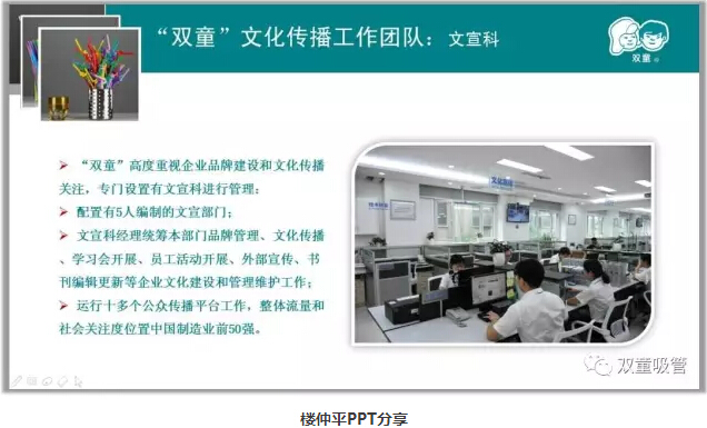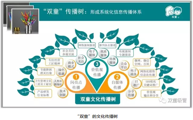 “左邊是閃亮點(diǎn)的傳播介紹,包括了綠色制造、節(jié)能降耗、精細(xì)化管理以及技術(shù)創(chuàng)新等內(nèi)容。右邊通過(guò)微博、微信、博客、官網(wǎng)、百科等制造話題,即時(shí)發(fā)布博文、軟文、帖子等內(nèi)容,并進(jìn)行互聯(lián)網(wǎng)、IT推廣、展位推廣等自媒體的傳播。上邊則是政府、媒體關(guān)注的價(jià)值觀傳播。三大部分組成了‘雙童’的文化傳播樹!”