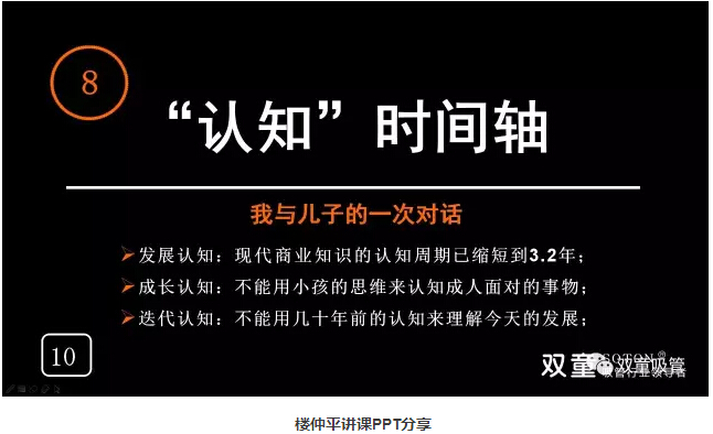 “認知”時間軸:“雙童”樓仲平通過自己與兒子的一次對話認知到不能用慣性思維來認知我們的下一代。樓仲平的成長也伴隨著不斷的否定,在認知、糾錯、不斷改變下實現自我成長。“創(chuàng)業(yè)者”最應該有“時間軸”的概念,需要擁有自我蛻變的能力,否則你就很難成長!