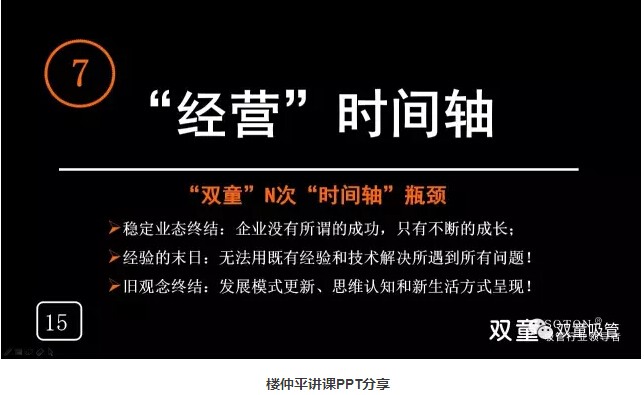 “經營”時間軸:樓仲平也用“雙童”的發(fā)展史告訴大家經營也是有時間軸的,會遇到瓶頸和“天花板”。企業(yè)沒有所謂的成功,只有不斷的成長,我們無法用既有經驗和技術解決所遇到所有問題!