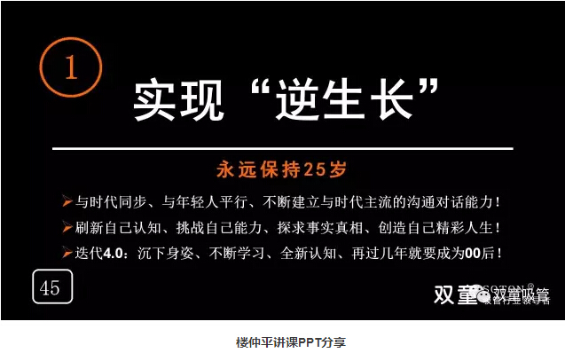實現“逆生長”:“雙童”樓仲平通過不斷的到各地演講寫課件鍛煉自己,嘗試新的突破,喜歡挑戰(zhàn)新的東西,永遠將自己定位在25歲,不斷學習去認知新的世界,去擁抱這個高速變化的世界,從而影響團隊并保持“雙童”不被淘汰。最后,樓總也鼓勵在座的企業(yè)主們不能老去,要與時代保持同步,接受不斷變化和挑戰(zhàn),迎合這個高度變化的世界!