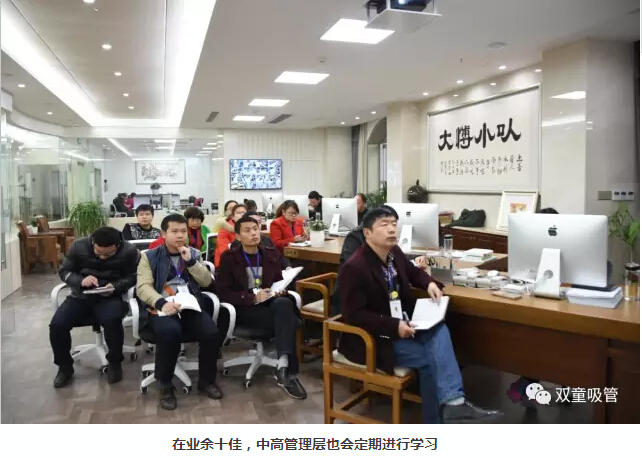 “雙童”一直倡導(dǎo)建設(shè)學(xué)習(xí)型企業(yè),營(yíng)造學(xué)習(xí)氛圍。在每周一和周三的19-21點(diǎn),舉辦全體員工的學(xué)習(xí)會(huì),確保所有員工每月有累計(jì)八小時(shí)的學(xué)習(xí)和培訓(xùn)!無(wú)論是掃地阿姨還是看門(mén)叔叔,都必須參加全員學(xué)習(xí)會(huì),提高自身認(rèn)知水平!
