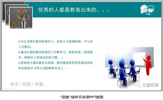 很多來(lái)“雙童”參觀的企業(yè)主都會(huì)問(wèn)為什么“雙童”員工的素質(zhì)如此好,“雙童”樓仲平會(huì)說(shuō)道:“其實(shí)全中國(guó)的員工素養(yǎng)都是一樣的,不一樣的是管理者如何去改變。”“雙童”是如何教育和影響員工的呢?快和吸管妞一起來(lái)看看吧!