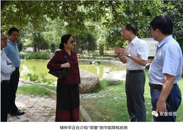 “雙童”樓仲平首先帶領(lǐng)部長先生一行參觀了“雙童”的廢水收集處理循環(huán)回用系統(tǒng)。他介紹道:“別看這只是一口普通的景觀湖,其實它分為上下兩層,上層是一米多深的景觀養(yǎng)魚湖,下層是四米五深的中水儲存池,專門用于儲存廢水呢!我們廠區(qū)內(nèi)所有員工產(chǎn)生的生活廢水都會被過濾后匯集到儲存池,用于綠化噴淋、洗車清潔、馬桶沖水等,不花費企業(yè)一分錢!”