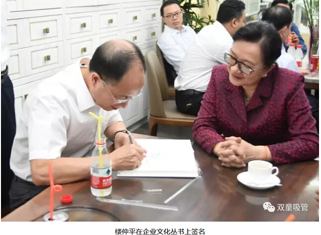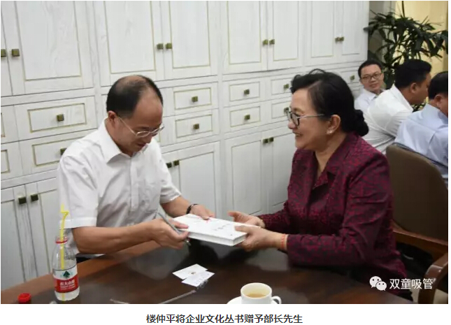 坐下后,看到桌子上的企業(yè)文化叢書,部長先生忍不住翻閱起來,并向樓仲平主動表示:“我太喜歡你們公司的企業(yè)文化了,能送我一本嗎?”她說:“我真是太喜歡‘雙童’了!看到部長先生對“雙童”文化如此感興趣,樓仲平非常希望能夠送她一套企業(yè)文化叢書。部長先生說道:“既然你把書贈予我,當然要幫我在上面簽名?!睒侵倨介_玩笑道:“自己只上過小學,不太會寫字,都是蓋章的?!辈块L先生大方直言自己也才讀了六年的書,可見要取得如今的成就,部長先生背后付出了多少努力呢!