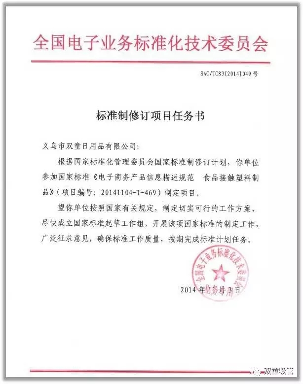 除了此項(xiàng)國(guó)家標(biāo)準(zhǔn)的制定之外,“雙童”還主導(dǎo)制定了《聚丙烯飲用吸管》中國(guó)國(guó)家標(biāo)準(zhǔn)等4項(xiàng)國(guó)家級(jí)標(biāo)準(zhǔn)。這在中國(guó)的中小企業(yè)中絕無(wú)僅有,“雙童”是第一家!接下來(lái),吸管妞就向大家介紹“雙童”的“國(guó)家標(biāo)準(zhǔn)制定之路”吧!