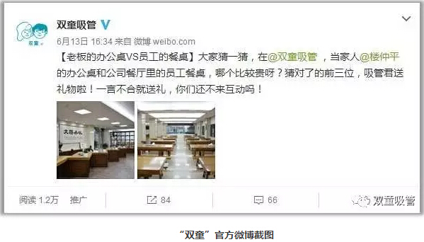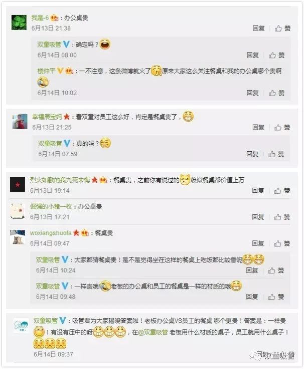前段時間,“雙童”官方微博發(fā)布了一條關(guān)于老板辦公桌和員工餐桌對比的微博引起了網(wǎng)友的熱議,不少粉絲都很詫異員工的餐桌居然和老板的辦公桌一樣貴,為什么“雙童”要給員工用這么好的硬件?下面,吸管妞就開揭開這個秘密!