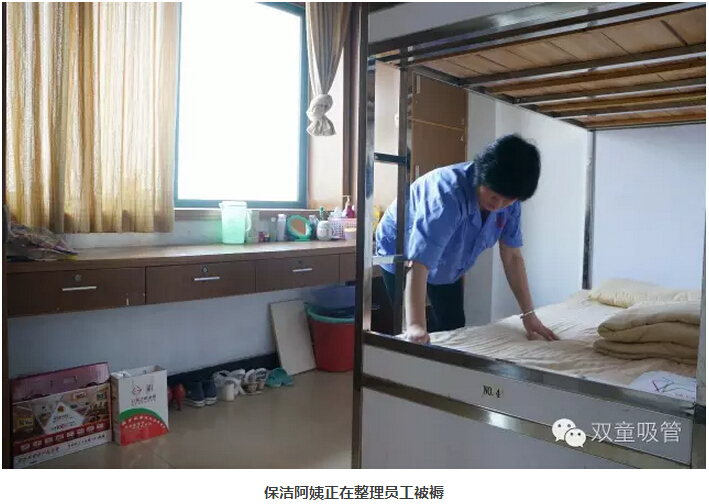 例如,每層寢室樓都配有專門打掃衛(wèi)生的阿姨,進(jìn)行衛(wèi)生間和寢室的日常打掃。保潔阿姨會(huì)將所有員工寢室的窗戶、衛(wèi)生間甚至垃圾桶等各個(gè)角落都擦拭干凈,垃圾不留過夜,就連員工的被褥每天也有阿姨進(jìn)行整理。