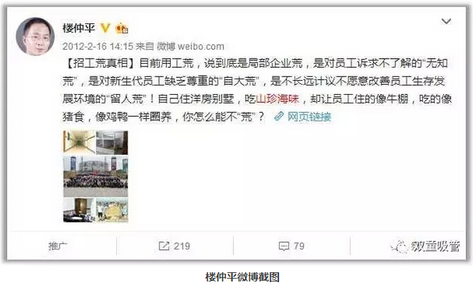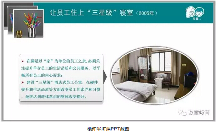 其實(shí),“雙童”樓仲平由于早年坎坷辛苦的創(chuàng)業(yè)經(jīng)歷,一直對(duì)農(nóng)民工感同身受,十分注重員工的吃住問題。早在2012年,樓仲平就發(fā)布了一條關(guān)于員工住宿的微博,引起了極大的關(guān)注。微博上寫道:自己住洋房別墅,卻讓員工住的像牛棚狗窩,你怎么能留得住員工?員工是企業(yè)的基礎(chǔ),對(duì)員工更好、企業(yè)反而會(huì)獲得更多!