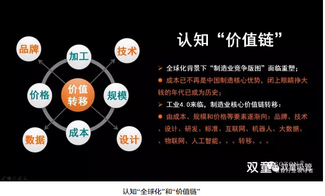 在全球化的背景下,成本不再是制造業(yè)的核心優(yōu)勢(shì)。企業(yè)必須面對(duì)時(shí)代的不斷變化,產(chǎn)業(yè)發(fā)展“棲”水草而居,中國(guó)制造商業(yè)競(jìng)爭(zhēng)“價(jià)值鏈”轉(zhuǎn)移逐漸從“規(guī)模型”向“價(jià)值型”轉(zhuǎn)變。企業(yè)經(jīng)營(yíng)“核心價(jià)值鏈”轉(zhuǎn)移,由成本、價(jià)格、設(shè)備、產(chǎn)品等要素逐漸轉(zhuǎn)向品牌、渠道、標(biāo)準(zhǔn)、研發(fā)、數(shù)據(jù)、互聯(lián)網(wǎng)…… 傳統(tǒng)業(yè)主杯具時(shí)代已經(jīng)來(lái)臨:經(jīng)驗(yàn)逐漸成為毒藥!