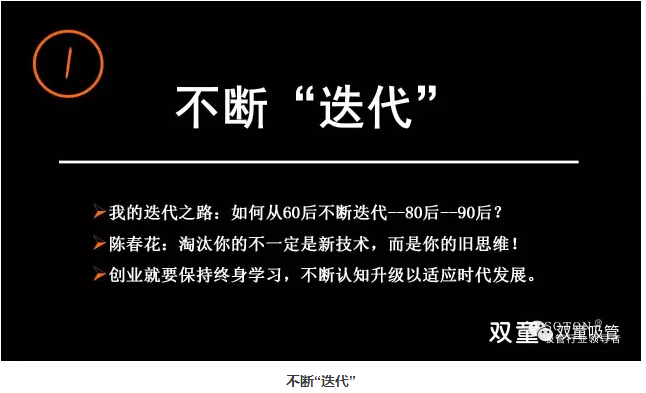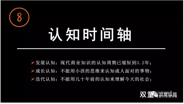 現(xiàn)代商業(yè)知識(shí)的認(rèn)知周期已縮短到3.2年,我們不能用小孩的思維來(lái)認(rèn)知成人面對(duì)的事物,更不能用幾十年前的認(rèn)知來(lái)理解今天的社會(huì)。每個(gè)人的成長(zhǎng)伴隨著不斷的否定,在認(rèn)知、糾錯(cuò)、不斷改變下實(shí)現(xiàn)自我成長(zhǎng)。“創(chuàng)業(yè)者”最應(yīng)該有“時(shí)間軸”的概念,需要擁有自我蛻變的能力,否則你就很難成長(zhǎng)!