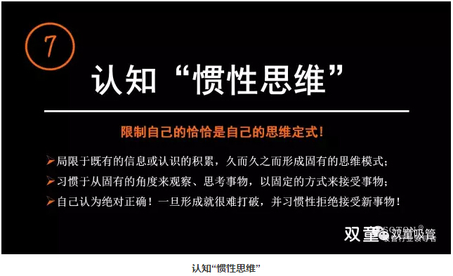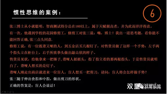 樓仲平通過(guò)“盲人買(mǎi)剪刀”及“吵架”兩個(gè)小案例和大家分享了認(rèn)知“慣性思維”:“我們常常會(huì)局限于既有的信息或認(rèn)識(shí)的積累,習(xí)慣于從固有的角度來(lái)觀察、思考事物。這種思維一旦形成就很難打破,并習(xí)慣性拒絕接受新事物,久而久之形成固有的思維模式!所以,很多時(shí)候限制自己的恰恰是自己的思維定式,我們要跳出自己的思維定式!”