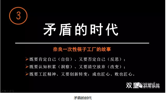 “雙童”樓仲平通過(guò)日本奈良一次性筷子的故事告訴大家成也工匠精神、敗也工匠精神,沒(méi)有改變,“工匠”精神也沒(méi)有用。作為創(chuàng)業(yè)者來(lái)講,我們不能用過(guò)往的經(jīng)驗(yàn)來(lái)理解發(fā)生的一切,否則你會(huì)被時(shí)代所拋棄。在不同的時(shí)代,你對(duì)時(shí)間和技術(shù)進(jìn)步的理解是不一樣的,既要肯定自己、又要否定自己;既要認(rèn)知積累、又要清空放棄;既要工匠精神、又要?jiǎng)?chuàng)新轉(zhuǎn)變!