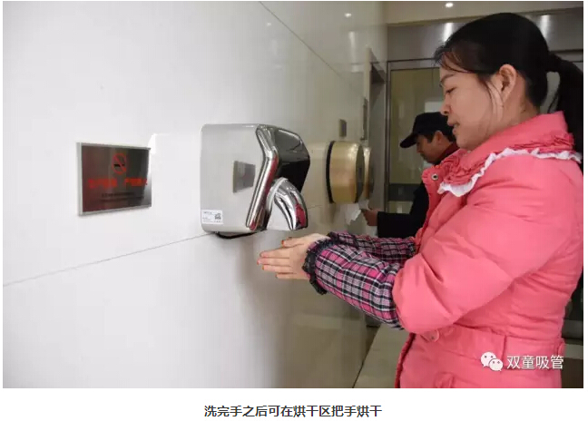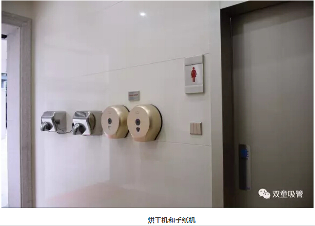 “雙童”每個(gè)洗手間的格局分明,除了男女衛(wèi)生間外,還設(shè)置了洗手區(qū)、烘干區(qū)、手紙區(qū),配置十分齊全。進(jìn)入衛(wèi)生間前,員工可以在手紙區(qū)取紙巾。洗手后,還可以用烘干機(jī)把手烘干。