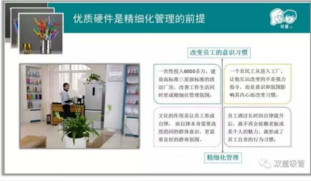 而優(yōu)質(zhì)硬件是精細(xì)化管理的前提,所以我們給員工使用五星級(jí)洗手間并不是有錢沒地花,而是給員工用五星級(jí)的硬件,引導(dǎo)員工改變自身的思維和行為方式,讓員工關(guān)注細(xì)節(jié)!“雙童”廁所革命的背后是“雙童”品質(zhì)追求的“人心和良心”,唯有員工的思想轉(zhuǎn)變了,生產(chǎn)的產(chǎn)品才能讓客戶放心!親,你們明白了嗎?