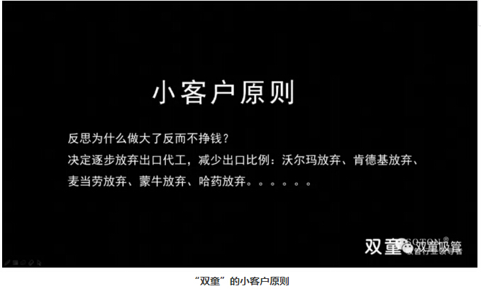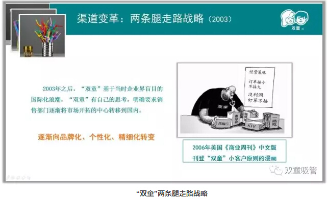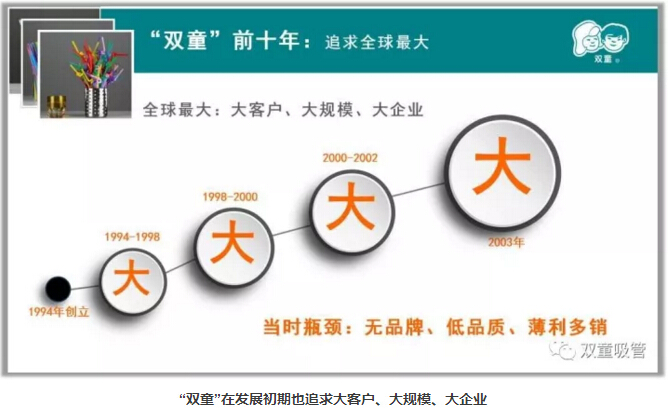 許多人都知道“雙童”有一個(gè)被收錄到清華、浙大等大學(xué)MBA教材的經(jīng)營(yíng)戰(zhàn)略,叫做“小客戶原則”。這個(gè)經(jīng)營(yíng)戰(zhàn)略指導(dǎo)“雙童”走出了企業(yè)“大而不強(qiáng)、薄利多銷(xiāo)”的發(fā)展瓶頸,從而牢牢占據(jù)吸管行業(yè)領(lǐng)導(dǎo)者的地位。那么,這個(gè)戰(zhàn)略是如何提出的呢?