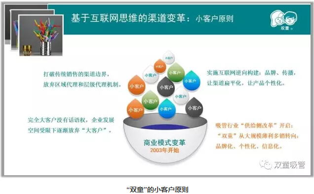 如今,在“雙童”的內(nèi)銷(xiāo)市場(chǎng)中,商超銷(xiāo)售占30%,個(gè)性化定制產(chǎn)品占30%,其余40%則是小客戶銷(xiāo)售。據(jù)統(tǒng)計(jì),“雙童”的小客戶總量已達(dá)到了12000多家,這些寶貴的客戶客觀上與“雙童”一直發(fā)生著動(dòng)態(tài)和靜態(tài)的貿(mào)易關(guān)系。有些靜態(tài)客戶可能一兩年才拿一次貨,一次拿幾箱產(chǎn)品。但在“雙童”看來(lái),它們都是寶貴的客戶。正是因?yàn)橛唵晤~不大,對(duì)產(chǎn)品有個(gè)性化要求,反而造就了很高的品牌黏性——它們不至于因?yàn)檫@幾箱吸管而再去找其他企業(yè),從而形成巨大的長(zhǎng)尾效應(yīng),通過(guò)訂單的積累,長(zhǎng)期為企業(yè)創(chuàng)造著價(jià)值。