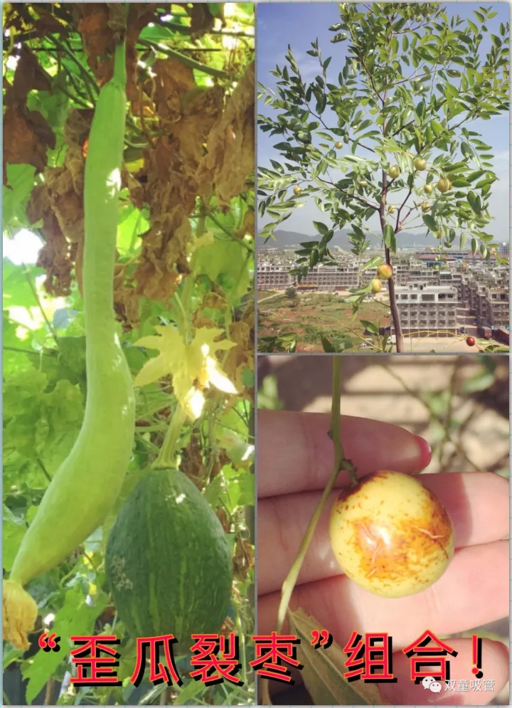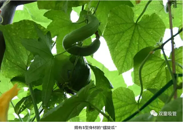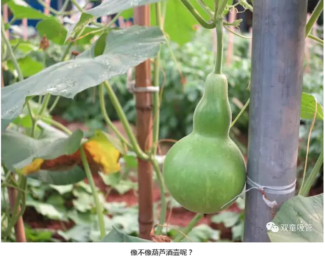 接下來這個瓜可是堪稱藝術(shù)品呢!一般的葫蘆瓜都是直筒的,而“雙童”菜園里的葫蘆瓜居然長成了一個名副其實的葫蘆瓜。吸管君直言,把瓜仁挖了,都可以當(dāng)酒壺啦!