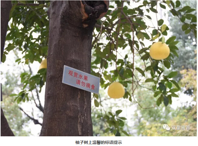 原來,為了“雙童”的生態(tài)和美觀,公司明確柚子是觀賞性水果,每棵柚子樹上都有“觀賞水果,請(qǐng)勿摘食”的字樣,提醒和引導(dǎo)員工不要摘食觀賞水果。