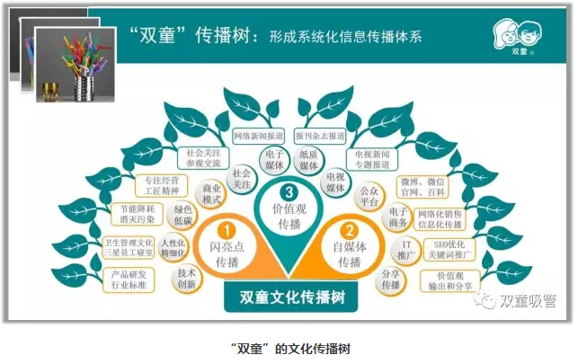 左邊是閃亮點的傳播介紹,包括了綠色制造、節(jié)能降耗、精細(xì)化管理以及技術(shù)創(chuàng)新等內(nèi)容。右邊通過微博、微信、博客、官網(wǎng)、百科等制造話題,即時發(fā)布博文、軟文、帖子等內(nèi)容,并進行互聯(lián)網(wǎng)、IT推廣、展位推廣等自媒體的傳播。上邊則是政府、媒體關(guān)注的價值觀傳播。三大部分組成了“雙童”的文化傳播樹!