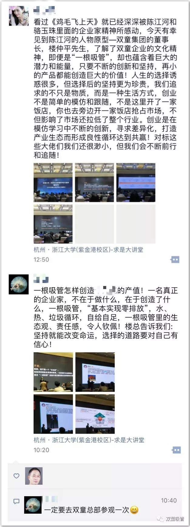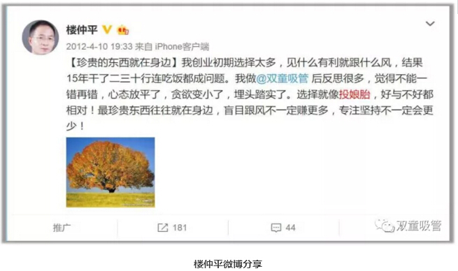 樓仲平回憶自己曾在2012年發(fā)布的微博中表明:“我在創(chuàng)業(yè)初期選擇太多,見什么有利就跟什么風(fēng),結(jié)果15年干了二三十行,一事無成。做雙童吸管后常反思,心態(tài)放平了,貪欲變小了,埋頭踏實(shí)了。”