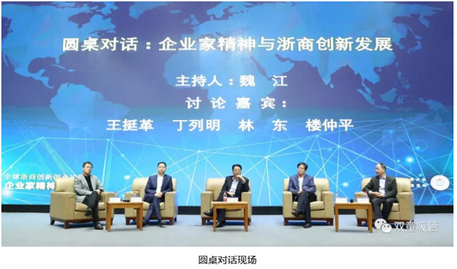 在圓桌對話上,由浙江大學(xué)管理學(xué)院院長魏江主持,物產(chǎn)中大集團(tuán)董事長王挺革、貝達(dá)藥業(yè)董事長丁列明、杭州綠盛集團(tuán)董事長林東及雙童吸管董事長樓仲平和創(chuàng)業(yè)者們展開“企業(yè)家精神與浙商創(chuàng)新發(fā)展”的對話。