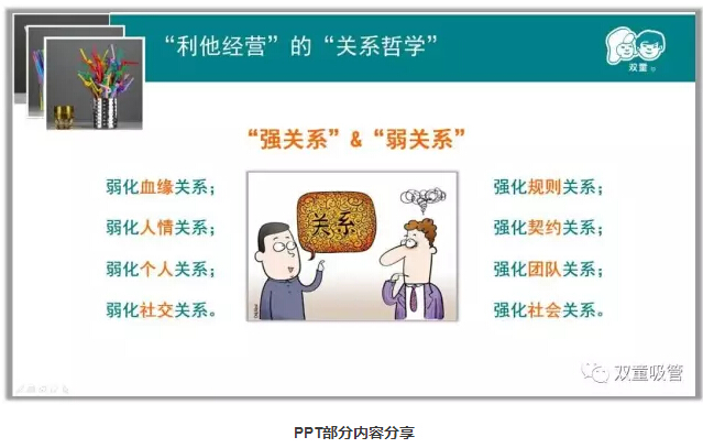 >>>> “利他經(jīng)營”的“關(guān)系哲學(xué)”:企業(yè)如何通過引導(dǎo)讓關(guān)系達(dá)到最優(yōu)配置?“雙童”樓仲平十分注重關(guān)系哲學(xué),通過弱化血緣關(guān)系,強(qiáng)化規(guī)則關(guān)系;弱化人情關(guān)系,強(qiáng)化契約關(guān)系;弱化個(gè)人關(guān)系,強(qiáng)化團(tuán)隊(duì)關(guān)系;弱化社交關(guān)系,強(qiáng)化社會關(guān)系,從而為企業(yè)持續(xù)發(fā)展創(chuàng)造良好條件!