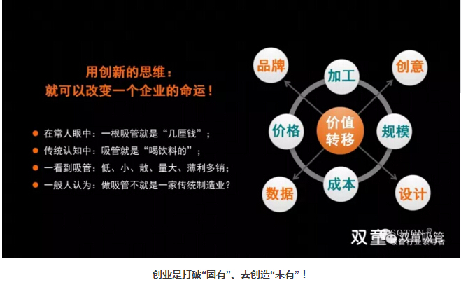 樓仲平也鼓勵(lì)創(chuàng)業(yè)者們積極參與到創(chuàng)新創(chuàng)業(yè)工作當(dāng)中,創(chuàng)新無限,一根吸管能可以,還有什么不可以?“雙童”就是從一家傳統(tǒng)制造型企業(yè),逐漸轉(zhuǎn)型成一家互聯(lián)網(wǎng)創(chuàng)新企業(yè),改變大家對吸管行業(yè) ‘低、小、散、弱’的傳統(tǒng)認(rèn)知,打破了世人所偏見的“不可能”!